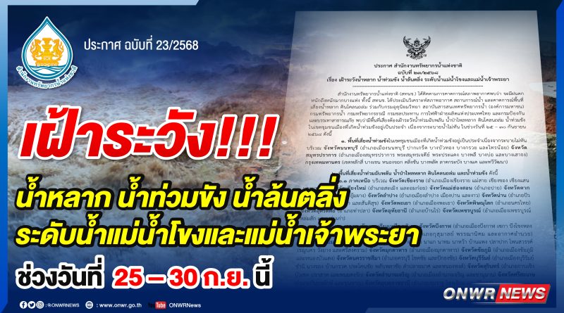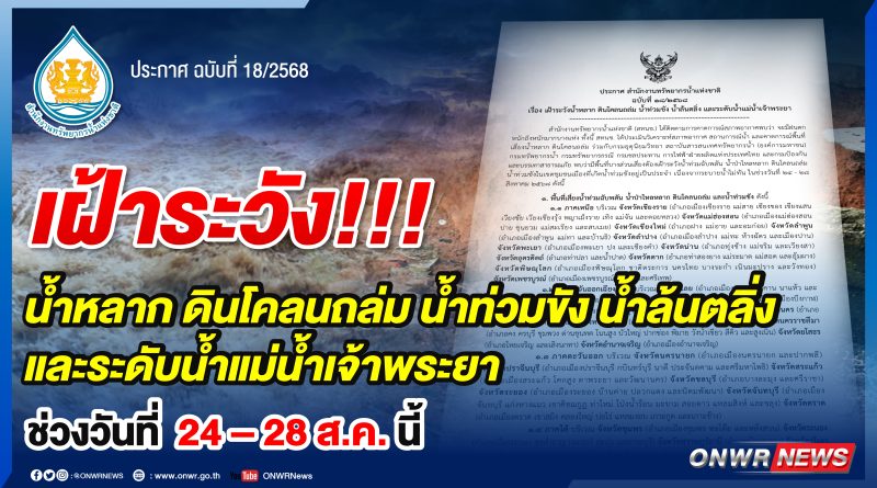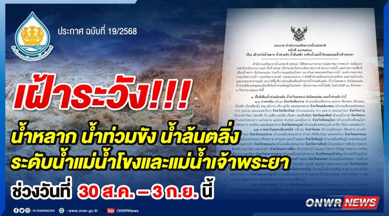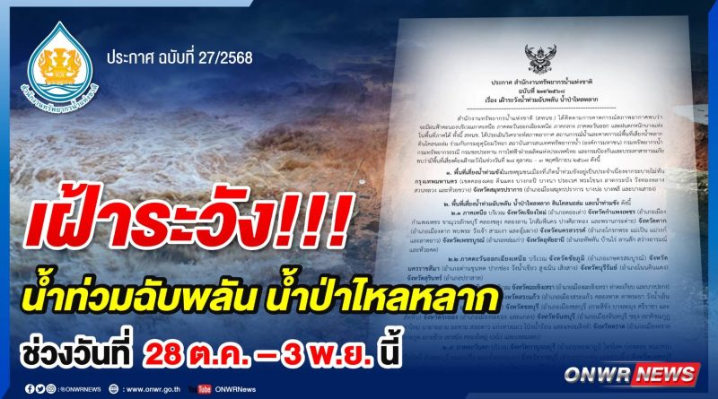 ประกาศฉบับที่ 27/2568 เรื่อง เฝ้าระวังน้ำท่วมฉับพลัน น้ำป่าไหลหลาก ช่วงวันที่ 28 ต.ค. – 3 พ.ย. นี้ 27 ตุลาคม 202527 ตุลาคม 2025 มงคลชัย กองรัตน์ 0 Comments อ่านต่อ...