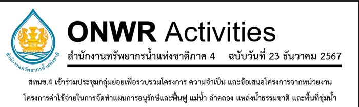 สำนักงานทรัพยากรน้ำแห่งชาติ 4 (สทนช 4) เข้าร่วมการประชุมกลุ่มย่อยในการจัดการวางแผนการอนุรักษ์และฟื้นฟู แม่น้ำ ลำคลอง แหล่งน้ำธรรมชาติ และพื้นที่ชุ่มน้ำ ฉบับวันที่ 23 ธันวาคม 2567 24 ธันวาคม 202424 ธันวาคม 2024 มงคลชัย กองรัตน์ 0 Comments อ่านต่อ...