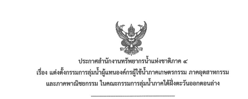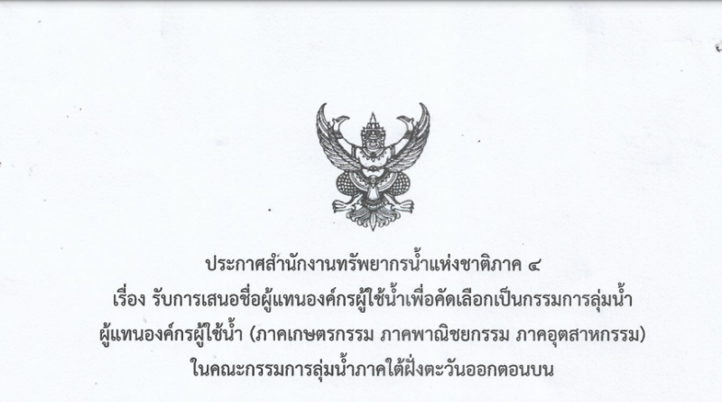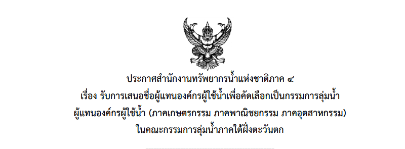 ประกาศสำนักงานทรัพยากรน้ำแห่งชาติภาค 4 เรื่อง รับการเสนอชื่อผู้แทนองค์กรผู้ใช้น้ำเพื่อคัดเลือกเป็นกรรมการลุ่มน้ำผู้แทนองค์กรผู้ใช้น้ำ(ภาคเกษตรกรรม ภาคพาณิชยกรรม ภาคอุตสาหกรรม) ในคณะกรรมการลุ่มน้ำภาคใต้ฝั่งตะวันออกตอนบน 20 มกราคม 202520 มกราคม 2025 มงคลชัย กองรัตน์ 0 Comments อ่านต่อ...