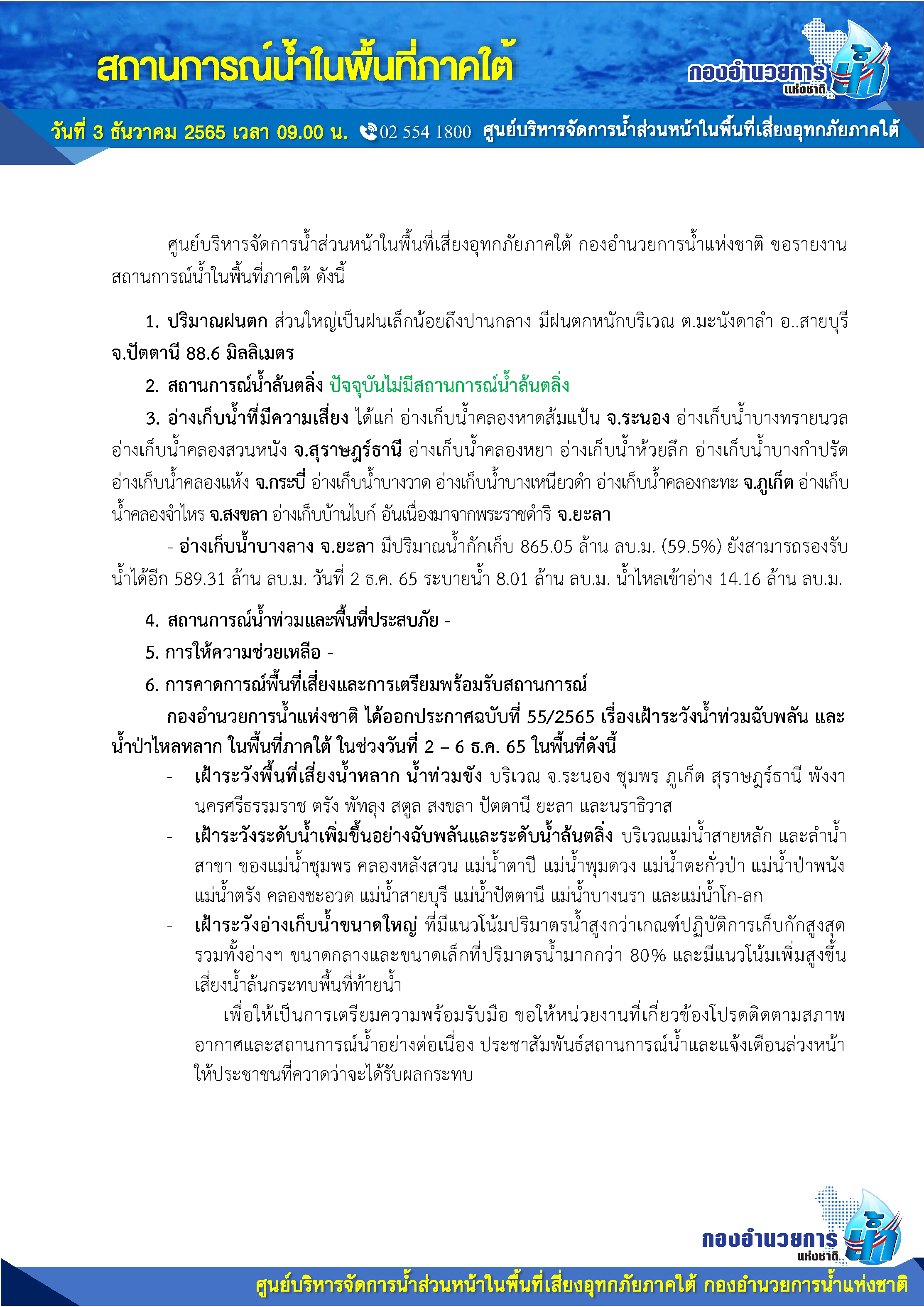 ศูนย์บริหารจัดการน้ำส่วนหน้าในพื้นที่เสี่ยงอุทกภัยภาคใต้ วันที่ 3/12/2565 6 ธันวาคม 20226 ธันวาคม 2022 มงคลชัย กองรัตน์ 0 Comments แชร์ : 0 More สถานการณ์น้ำพื้นที่ภาคใต้