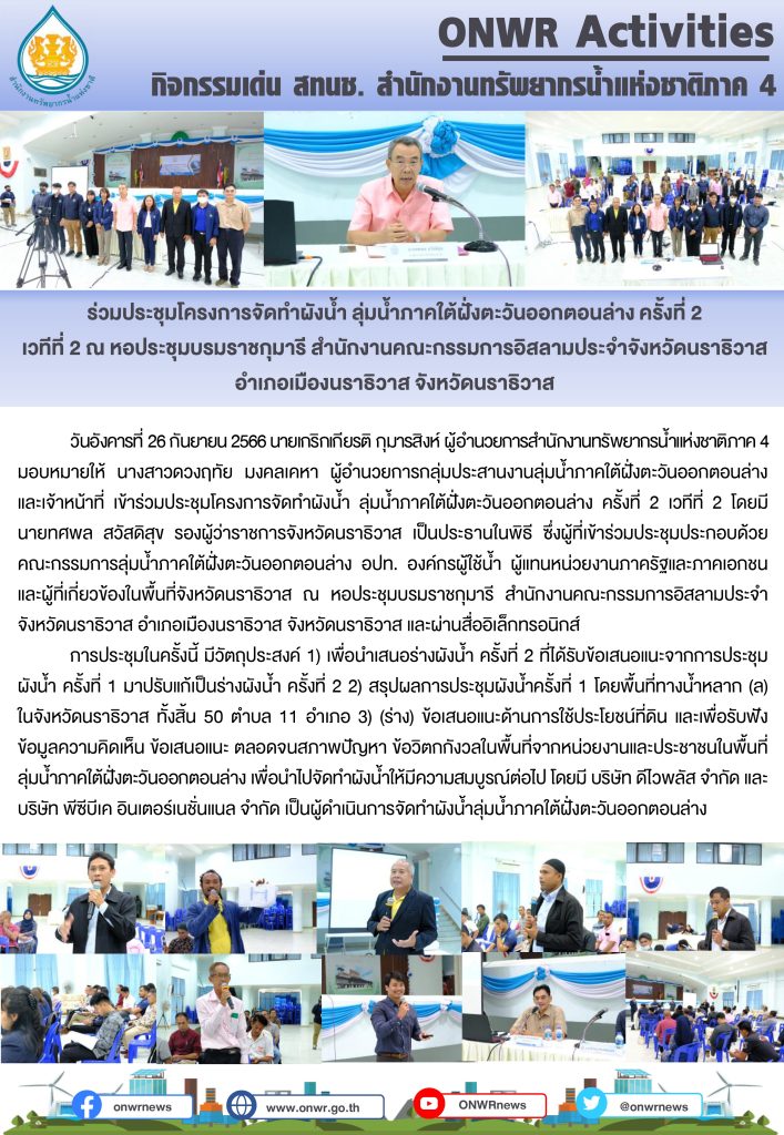 ร่วมประชุมโครงการจัดทำผังน้ำ ลุ่มน้ำภาคใต้ฝั่งตะวันออกตอนล่าง ครั้งที่ 2 เวทีที่ 2 ณ หอประชุมบรมราชกุมารี สำนักงานคณะกรรมการอิสลามประจำจังหวัดนราธิวาส 27 กันยายน 202327 กันยายน 2023 มงคลชัย กองรัตน์ 0 Comments แชร์ : 0 More One Page