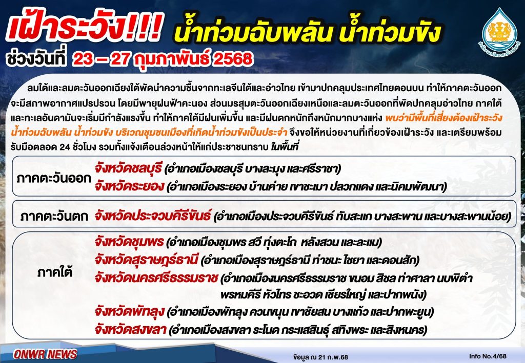 เฝ้าระวัง!!! น้ำท่วมฉับพลัน น้ำท่วมขัง ช่วงวันที่ 23-27 กุมภาพันธ์ 2568 24 กุมภาพันธ์ 202524 กุมภาพันธ์ 2025 มงคลชัย กองรัตน์ 0 Comments แชร์ : 0 More แจ้งเตือน