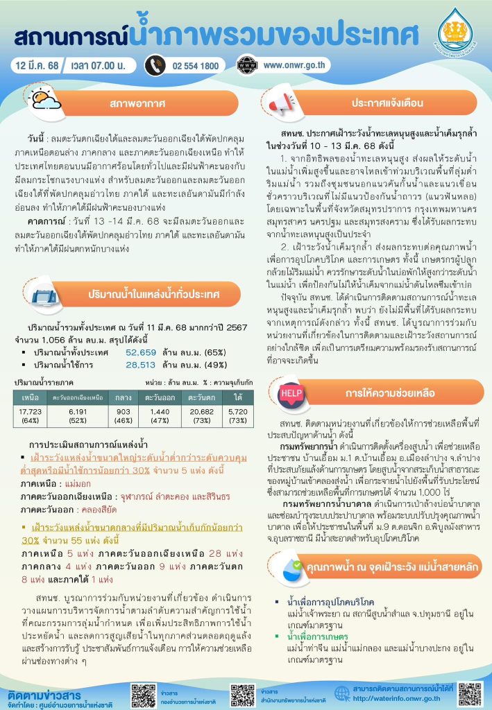 สรุปสถานการณ์น้ำภาพรวมของประเทศ วันที่ 12 มี.ค. 68 12 มีนาคม 202512 มีนาคม 2025 มงคลชัย กองรัตน์ 0 Comments แชร์ : 0 More รายงานสรุปสถานการณ์น้ำ