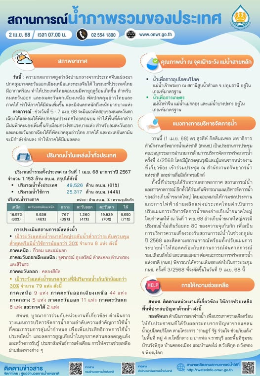 สรุปสถานการณ์น้ำภาพรวมของประเทศ วันที่ 2 เม.ย. 68 2 เมษายน 20252 เมษายน 2025 มงคลชัย กองรัตน์ 0 Comments แชร์ : 0 More รายงานสรุปสถานการณ์น้ำ