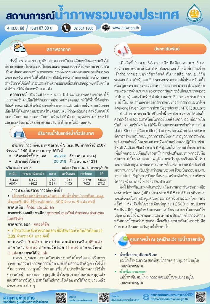 สรุปสถานการณ์น้ำภาพรวมของประเทศ วันที่ 4 เม.ย. 68 4 เมษายน 20254 เมษายน 2025 มงคลชัย กองรัตน์ 0 Comments แชร์ : 0 More รายงานสรุปสถานการณ์น้ำ