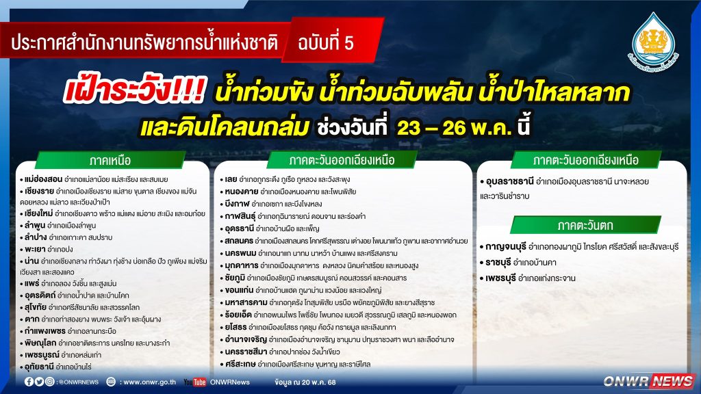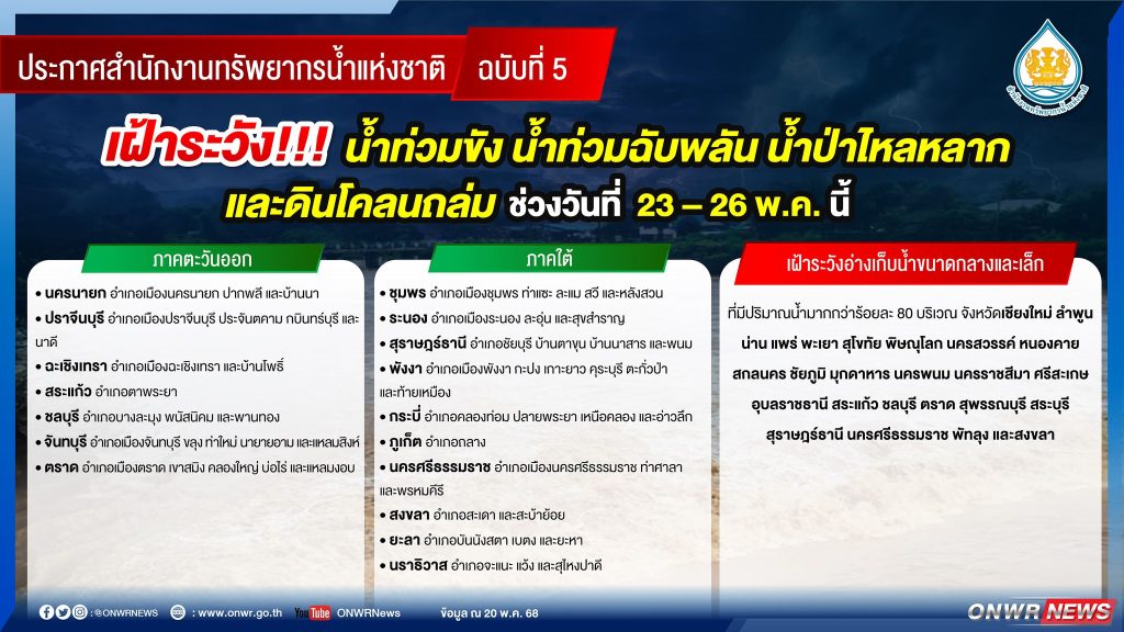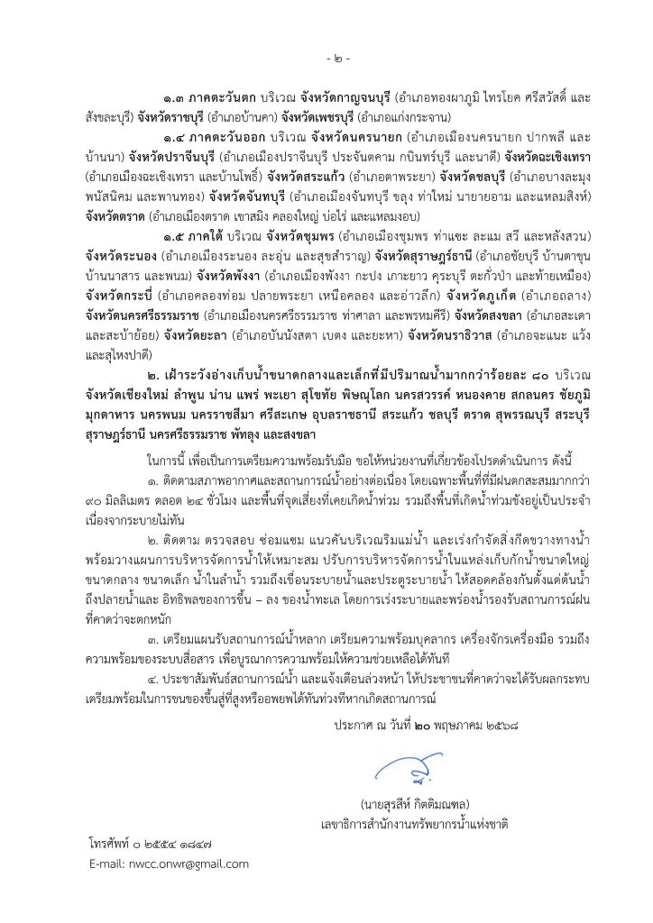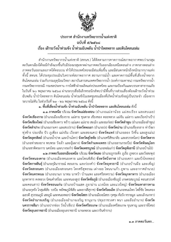 ประกาศ สำนักงานทรัพยากรน้ำแห่งชาติ ฉบับที่ 5/2568 เรื่อง เฝ้าระวังน้ำท่วมขัง น้ำท่วมฉับพลัน น้ำป่าไหลหลาก และดินโคลนถล่ม 21 พฤษภาคม 202521 พฤษภาคม 2025 มงคลชัย กองรัตน์ 0 Comments แชร์ : 0 More แจ้งเตือน