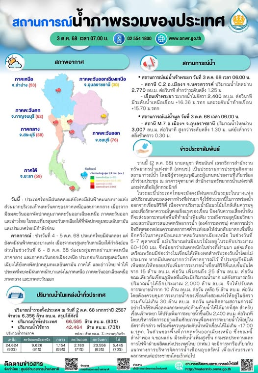 สรุปสถานการณ์น้ำภาพรวมของประเทศ วันที่ 3 ต.ค. 68 7 ตุลาคม 20257 ตุลาคม 2025 มงคลชัย กองรัตน์ 0 Comments แชร์ : 0 More รายงานสรุปสถานการณ์น้ำ