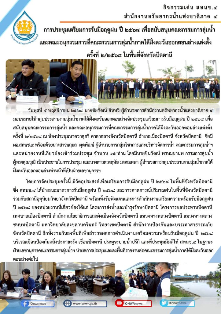 การประชุมเตรียมการรับมือฤดูฝน ปี 2568 เพื่อสนับสนุนคณะกรรมการลุ่มน้ำ และคณะอนุกรรมการที่คณะกรรมการลุ่มน้ำภาคใต้ฝั่งตะวันออกตอนล่างแต่งตั้ง ครั้งที่ 2/2568 ในพื้นที่จังหวัดปัตตานี 6 พฤศจิกายน 20256 พฤศจิกายน 2025 มงคลชัย กองรัตน์ 0 Comments แชร์ : 0 More One Page