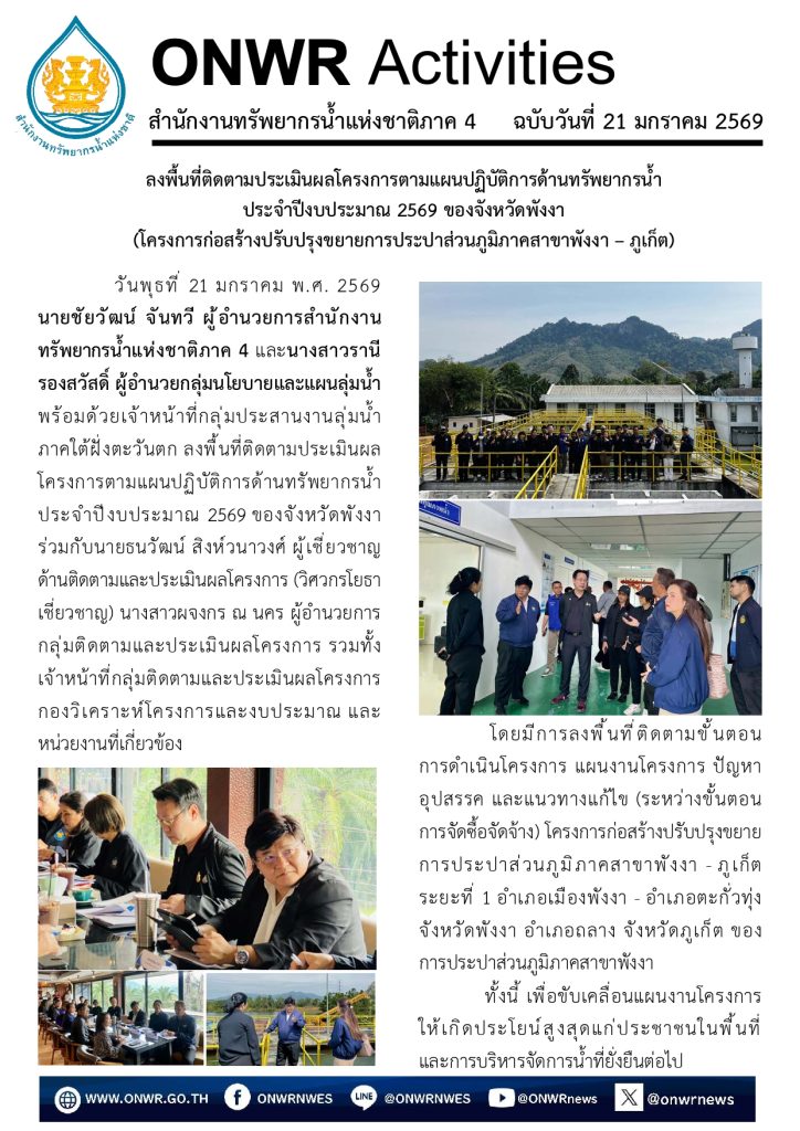 ลงพื้นที่ติดตามประเมินผลโครงการตามแผนปฏิบัติการด้านทรัพยากรน้ำ ประจำปีงบประมาณ 2569 ของจังหวัดพังงา (โครงการก่อสร้างปรับปรุงขยายการประปาส่วนภูมิภาคสาขาพังงา – ภูเก็ต) 22 มกราคม 202622 มกราคม 2026 มงคลชัย กองรัตน์ 0 Comments แชร์ : 0 More One Page