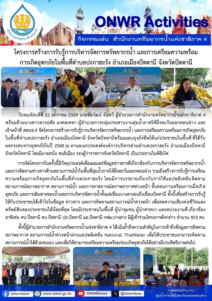 โครงการสร้างการรับรู้การบริหารจัดการทรัพยากรน้ำ และการเตรียมความพร้อม การเกิดอุทกภัยในพื้นที่ตำบลปะกาฮะรัง อำเภอเมืองปัตตานี จังหวัดปัตตานี 26 มกราคม 202626 มกราคม 2026 มงคลชัย กองรัตน์ 0 Comments แชร์ : 0 More One Page