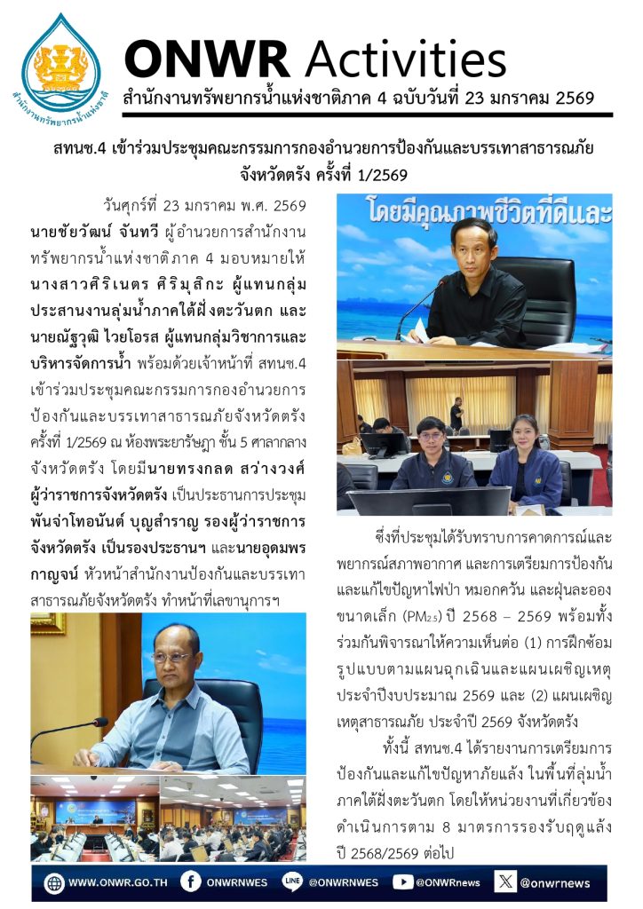 สทนช.4 เข้าร่วมประชุมคณะกรรมการกองอำนวยการป้องกันและบรรเทาสาธารณภัย จังหวัดตรัง ครั้งที่ 1/2569 26 มกราคม 202626 มกราคม 2026 มงคลชัย กองรัตน์ 0 Comments แชร์ : 0 More One Page